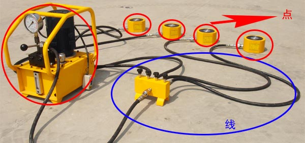 “點(diǎn)”即檢查系統(tǒng)的動(dòng)力源——液壓泵站和執(zhí)行元件——薄型液壓千斤頂、電動(dòng)機(jī)。然后檢查“線”——?jiǎng)恿υ吹綀?zhí)行元件之間經(jīng)過(guò)的管路和控制元件。